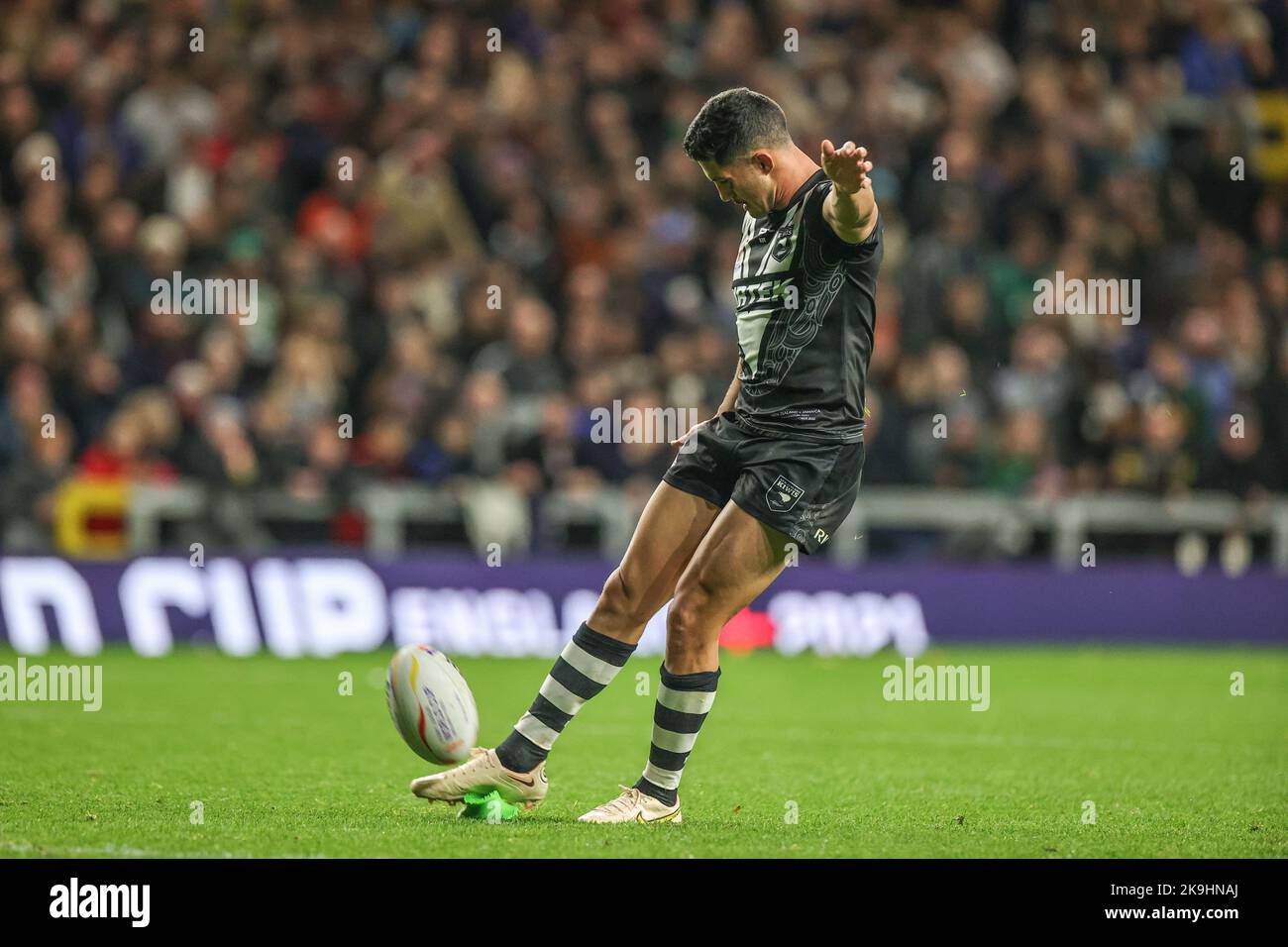 Leeds Grossbritannien 28 Oktober 2022 Dylan Brown Aus Neuseeland Konvertiert Wahrend Des Rugby League World Cup 2021 Gruppe C Spiels Neuseeland Gegen Irland Im Headingley Stadium Leeds Grossbritannien 28 Oktober 2022 Foto Von
